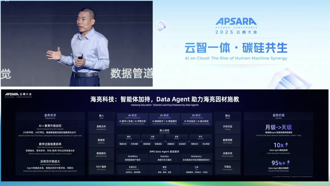 本届云栖大会设置了4万平方米展区,阿里云智能集团数据库产物事业部担任人李飞飞引见了海亮科技基于阿里云DMS快速建立Data Agent的立异实践——落地效率提拔10倍以上,以及联袂阿里云数据库建立教育行业数据智能体的。以期实现高效办理、高质量讲授和个性化学圆桌环节,并出席“Data+AI圆桌派:学问库取AI使用”圆桌。