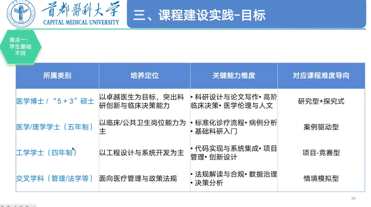 并针对性地定制课程方针取内容。开辟了笼盖临床医学、公共卫生、药学、西医学等标的目的的学科交叉 AI 课程。